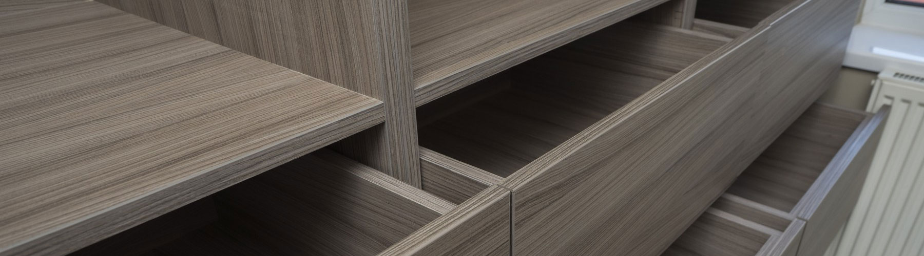 Supply and installation of custom made built in bedroom furniture to fit out a new walk in wardrobe space. The wardrobe features a range of drawers, hanging racks, shelving and a mirror. The wardrobe has been specifically designed to maximise the amount of space on offer ensuring there is as much storage as possible.